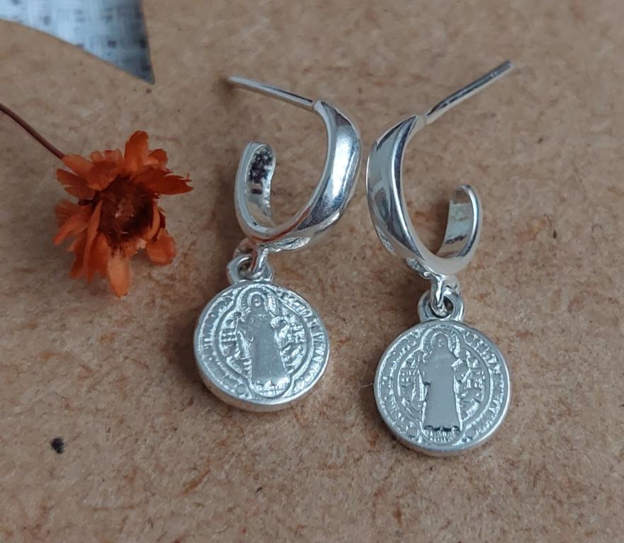 Brinco São Bento pêndulo, meia argola lisa, tarraxa, prata925